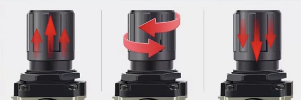 Există o scară de presiune pe capacul de reglare. Când este furnizat aer, trageți butonul în sus și rotiți-l în sensul acelor de ceasornic spre semnul „+” pentru a crește presiunea. După reglare, apăsați butonul în jos pentru a-l bloca.