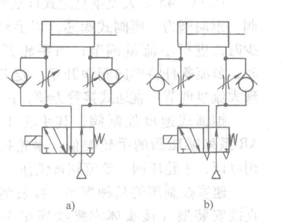 · În (a) (accelerare evacuare), când supapa direcțională este alimentată, supapa de reținere de pe partea de admisie a cilindrului se deschide, permițând umplerii rapide a părții fără tijă. Aerul din partea tijei poate fi evacuat doar prin supapa de accelerație. Prin reglarea deschiderii clapetei de accelerație, viteza cilindrului poate fi controlată. Această metodă asigură o mișcare stabilă a pistonului și este circuitul cel mai frecvent utilizat.