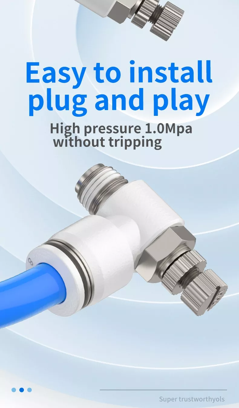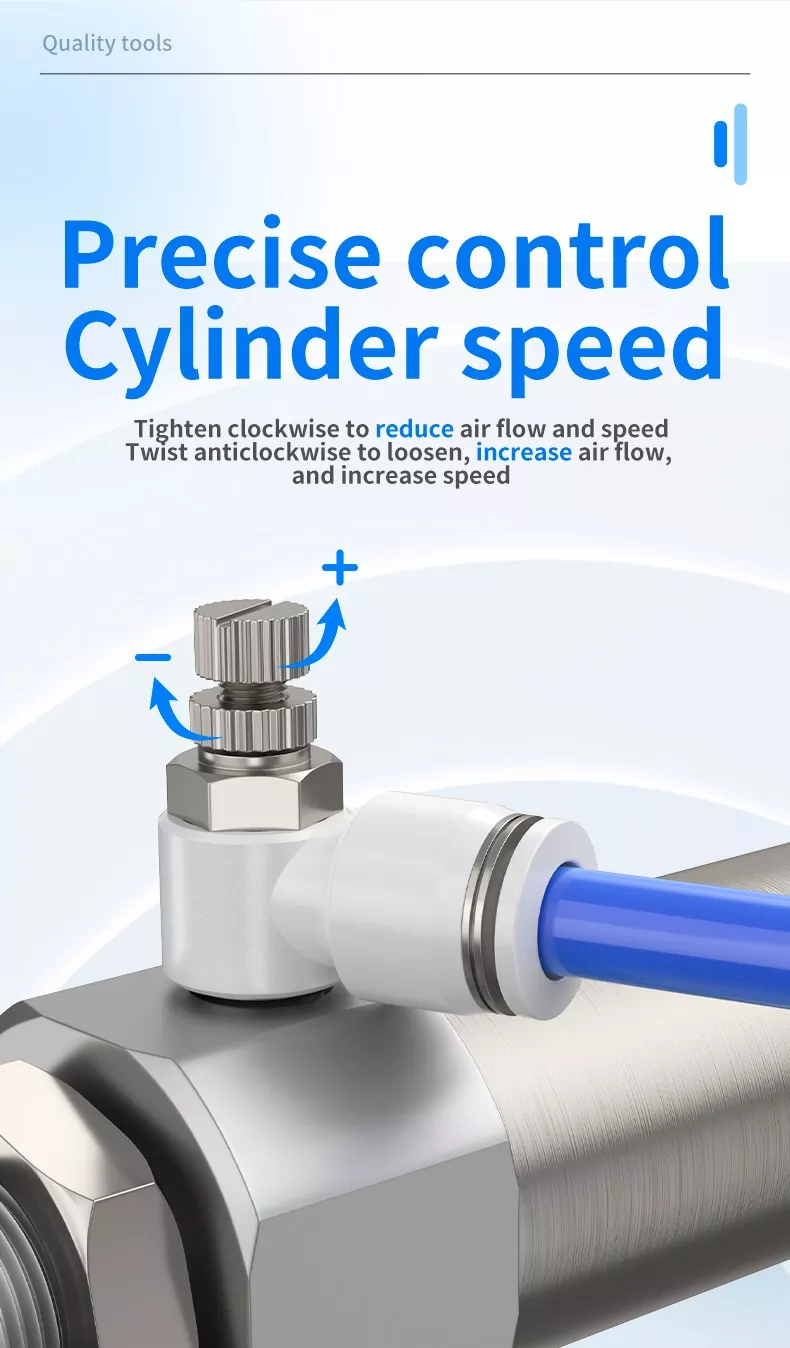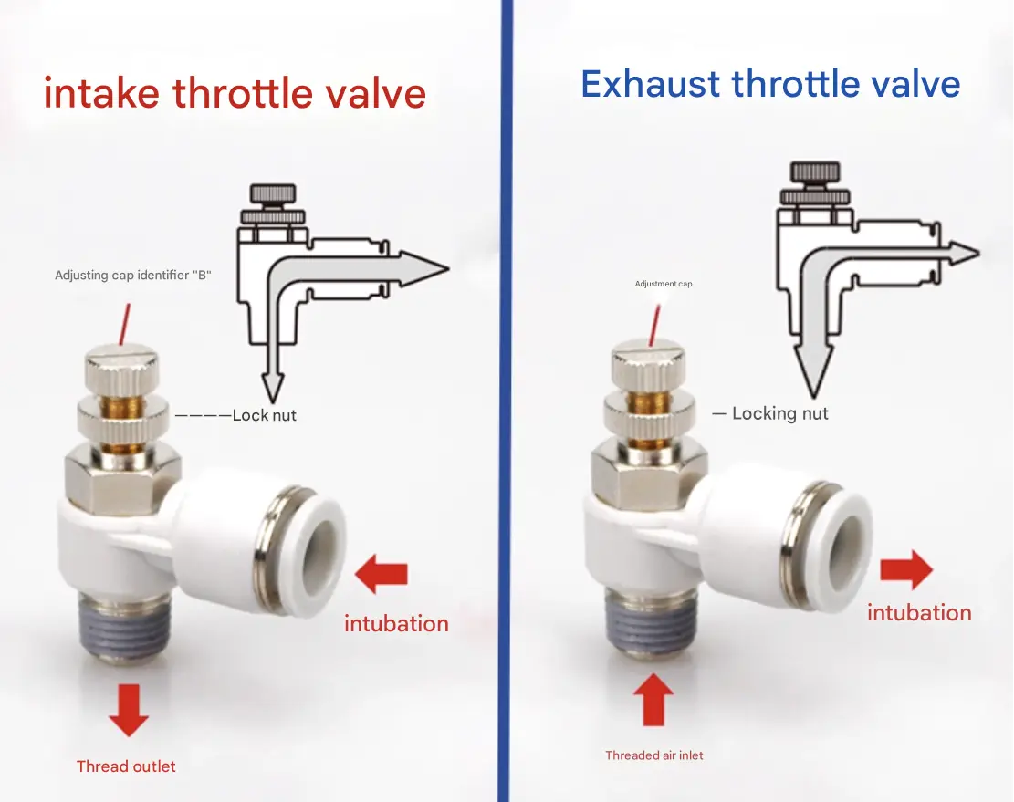 Din simbolurile funcționale, putem vedea că atât supapele de control al debitului de evacuare, cât și cele de admisie sunt supape de accelerație cu un singur sens, controlând debitul într-o singură direcție, permițând în același timp să treacă liber fluxul de aer invers. Pentru cilindrii cu dublă acțiune, supapele de accelerație de evacuare sunt preferate pentru a îmbunătăți stabilitatea mișcării cilindrului. Pentru cilindrii cu acțiune simplă, care folosesc de obicei un arc pentru extindere sau retragere atunci când nu există alimentare cu aer, gazul trebuie să depășească forța arcului în timpul funcționării, astfel încât supapele de accelerație de admisie sunt potrivite pentru controlul vitezei.