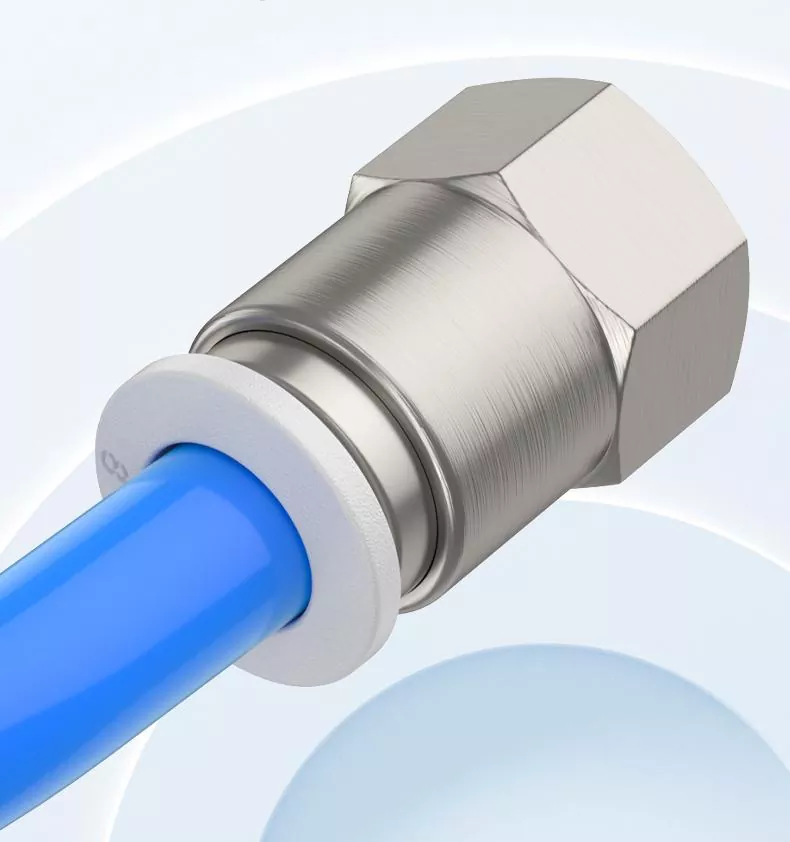 PCF feminin Push în montarea tubului și firul masculin PC Push Drept în montarea tubului, toate aparțin tipului de bază push-in-in-mondting.Dar PCF este feminin r firul drept. Firul intern este utilizat pentru a conecta componentele filetate externe, iar capătul tubului de inserție este conectat la un furtun. și instalat mai compact