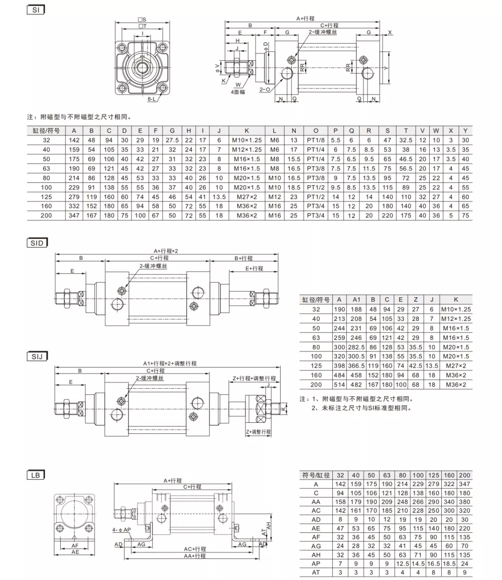 Cilindrii pneumatici standard ISO15552 din seria SI sunt disponibile în trei tipuri: standard cu dublă acțiune, SID cu dublă tijă cu dublă acțiune și SIJ cu dublă tijă cu dublă acțiune cu cursă reglabilă. Acestea sunt conforme cu standardul ISO 15552, ceea ce înseamnă că dimensiunile lor de instalare sunt mai mari decâtcilindri pneumatici SUde aceeași mărime. Accesoriile fixe nu sunt interschimbabile și sunt compatibile doar cu specificațiile ISO 15552 (fost ISO 6431).