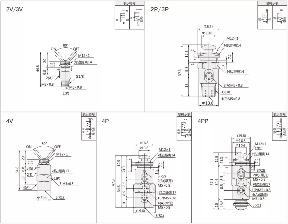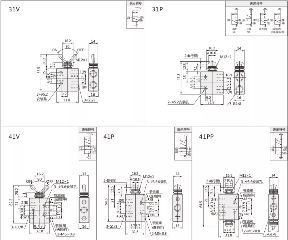 Supapa de comutare din seria TAC are 2 poziții 2, 2 poziții 3 căi și 2 poziții 5 pot fi alese. Un tip de tip de pârghie și două tipuri de tip: M5, G1/8.